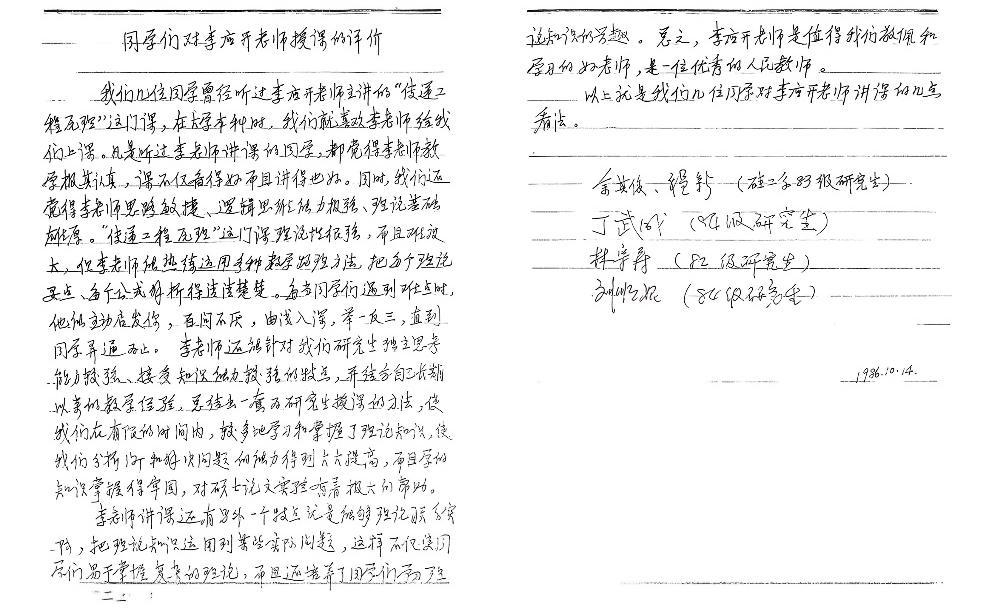 那个年代不比现在,没有网络资料可以查,学生想学点课外知识都难。于是我自己备课,找各种参考书,翻遍了当时苏联的教科书,不但把每个知识点摸透,还要琢磨怎么把抽象的理论讲得通俗,怎么做到理论联系实际,怎么把原理和推理过程讲清楚。我从始至终坚持,备课必须认真,每一个知识点、每一句话,都要站在学生的角度想,确保他们可以理解、能够跟上。今天来到校史馆,看到当年研究生和本科生写给我的评价,称赞我讲课逻辑清晰、深入浅出、讲深讲透、理论联系实际、风趣幽默,我心里倍感温暖,也深深觉得,所有的付出都值得。