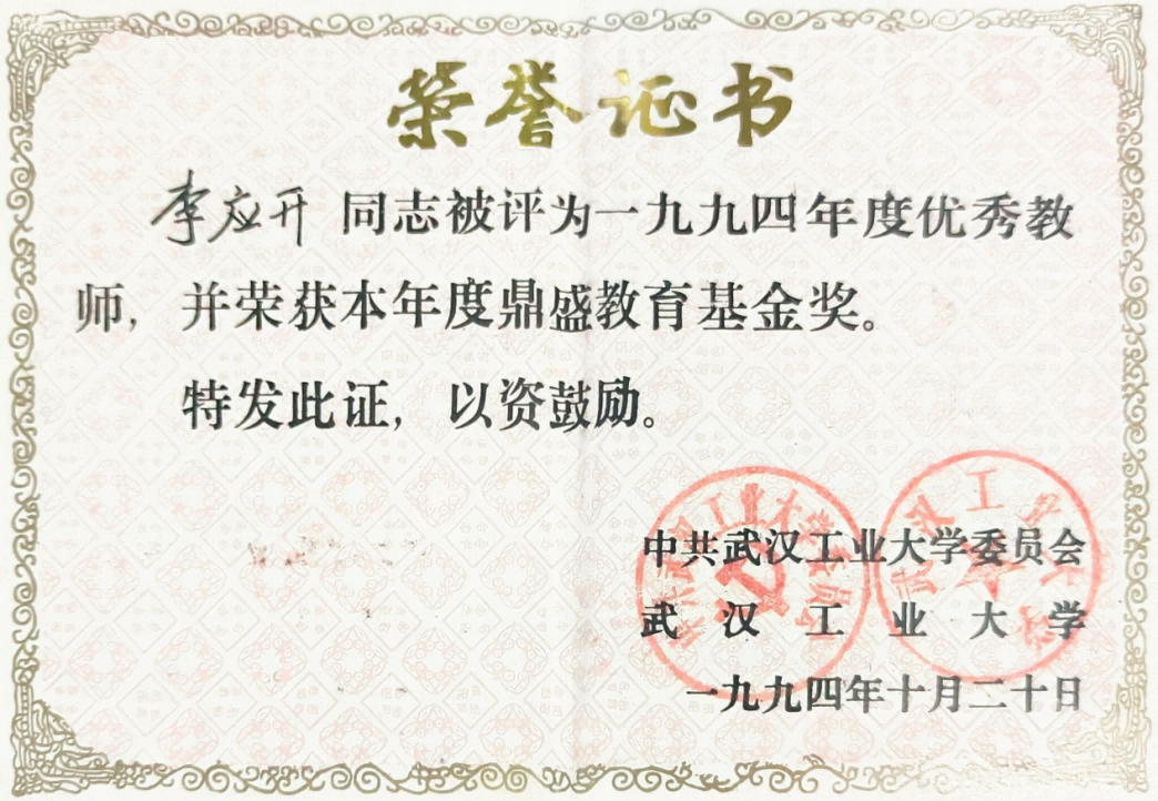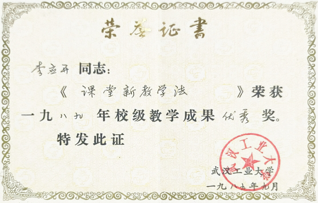在多年的教学工作中,我先后获得过多项荣誉与肯定。1957年在沈阳工作期间,我首次获得校级表扬,时任副校长林松对我予以表彰;1963年,在北京建工学院全体教师工作会议上他再次表扬了我。这份肯定,让我更坚定了把课讲好的初心。1989年,我探索实践的“课堂新教学法”荣获校级教学成果优秀奖;1994年,我被评为优秀教师,并荣获本年度鼎盛教育基金奖。