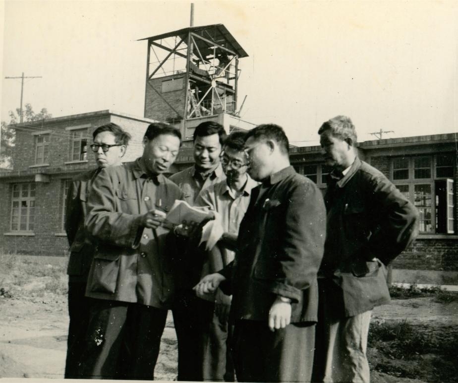 图为院长塞风和建材部科教局副局长张付汉参观研究工地现场(手持资料为李应开)